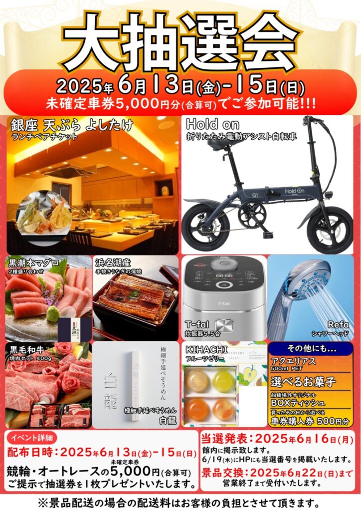 ランチペアチケットや電動自転車など豪華賞品が当たる船橋場外恒例、大好評の大抽...