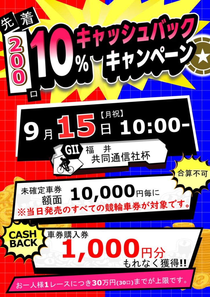 9/15発売の全ての競輪車券が対象!! 未確定車券額面1万円ごとになんと1,000円分の車... -