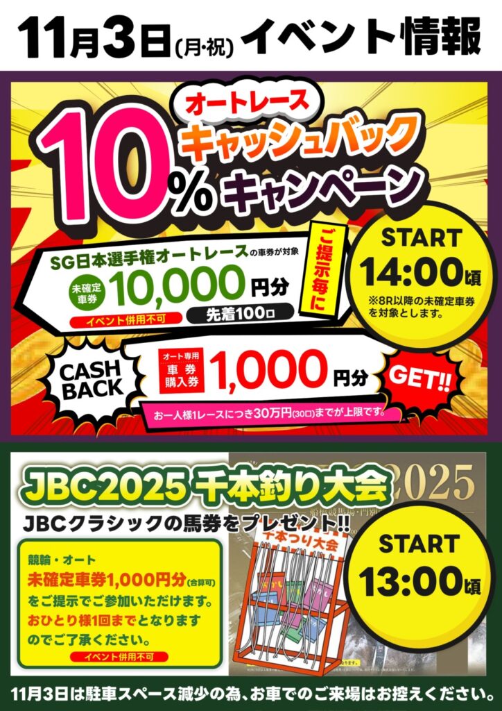 11/3【10%キャッシュバック&JBC千本釣り】