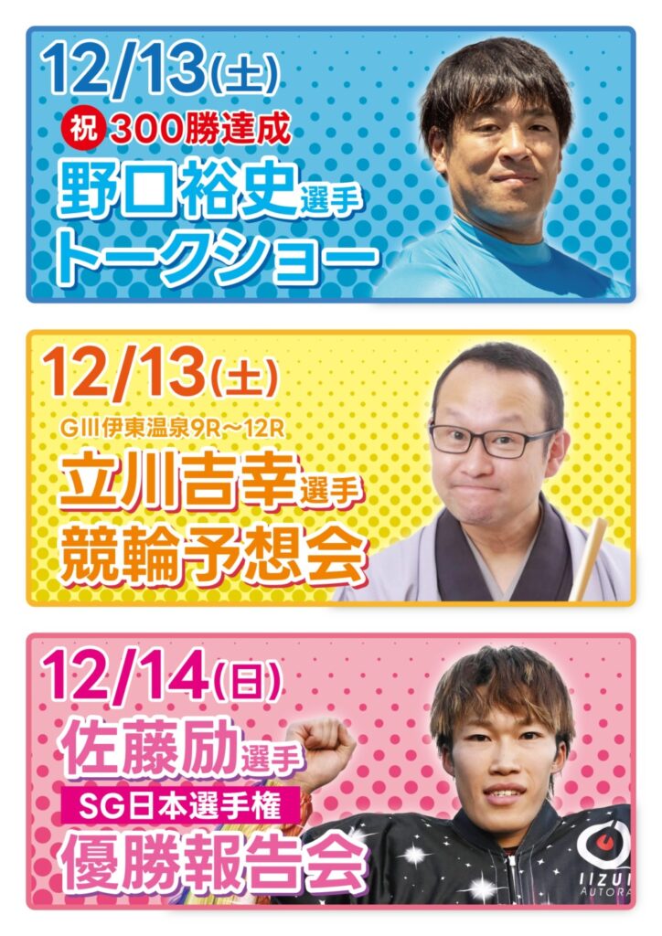 12月の選手イベントと予想会のお知らせです✨ 🎄12/13(土) 野口裕史選手300勝達成ト... -