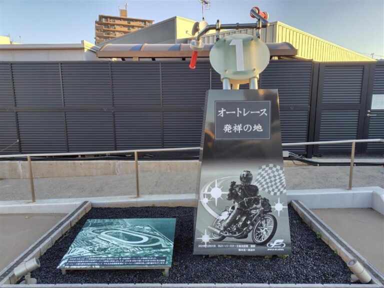 船橋競馬場内の一角に建てられたこのモニュメントは、オートレースの原点を静かに、そして力強く語りかけてきます。鋼鉄のエンジン音が響いていたあの日々、選手たちの汗と歓声が交差した熱狂の瞬間。それらの記憶を、確かにこの場所が刻み続けているのです。
