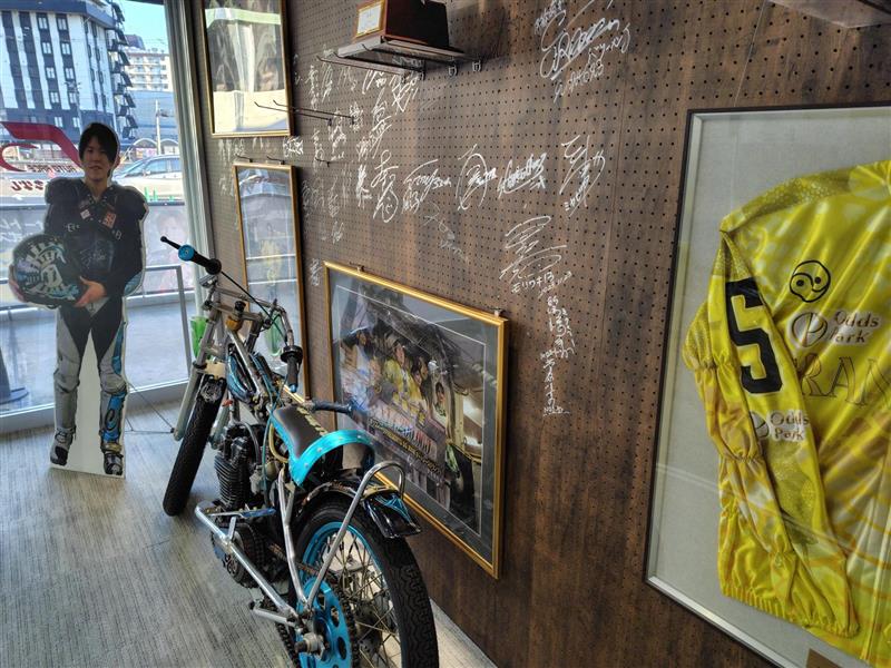 壁いっぱいに並ぶ選手たちの直筆サインや、迫力あるレースシーンの写真が、オートレースの魅力を身近に感じさせてくれます。